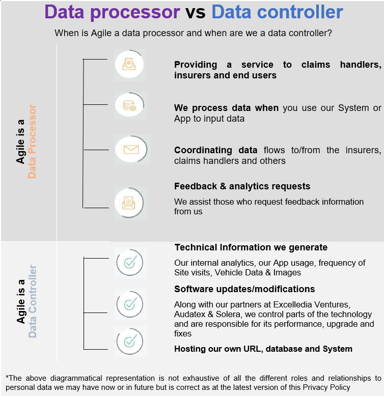 For the vast majority of our work, we act under instruction from other companies acting on your behalf i.e. Your Insurer, Broker, Claims Management Company, Telematics Service Provider, Vehicle Manufacturer, Lease, Rental, Accident Assistance or Breakdown Company who are more directly responsible for handling a claim, or dealing with or advising on insurance, or managing a customer claim or a claims settlement. We provide our AI-based tools and services in order to implement these requests. This makes us a data processor under GDPR. But as owners of our company, as an employer, and creator of our tools and services we are a data controller in respect of our Systems, technical decisions and our employees. The diagram below helpfully depicts the difference.